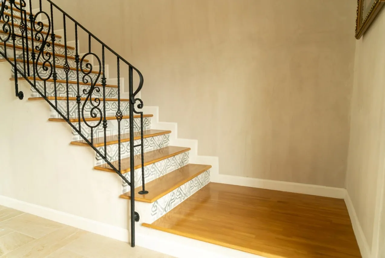 Главная роль в дизайне отведена гармоничному союзу материалов. Теплый, золотистый оттенок ступеней из бука создает ощущение уюта, в то время как перила из кованого металла добавляют композиции строгости и изысканности. Изящные декоративные узлы на балясинах подчеркивают тонкую ручную работу, а деликатный орнамент на подступенках вносит в дизайн нотку эксклюзивности и завершенности.